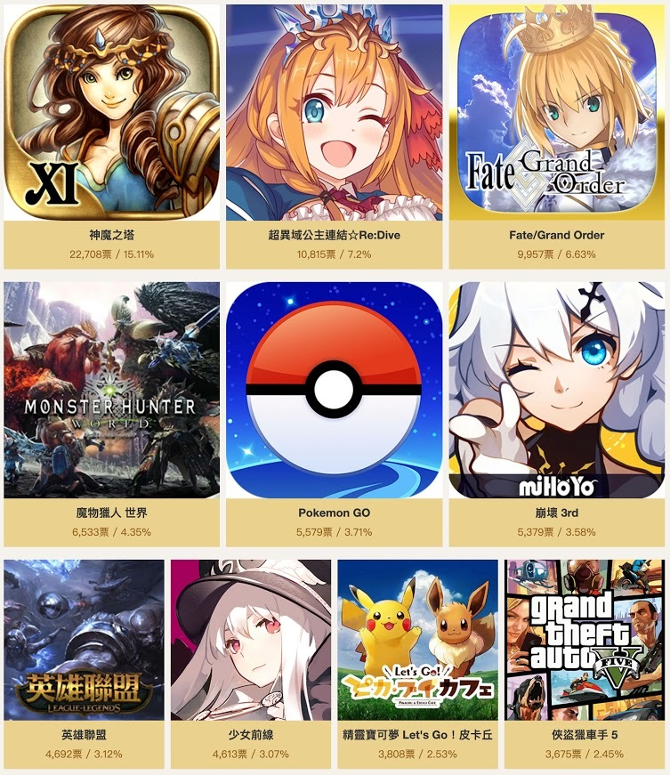 前十款游戏依次是:《神魔之塔》、《公主连结Re:Dive》、《Fate/Grand Order》、《怪物猎人:世界》、《Pokemon Go》、《崩坏3rd》、《英雄联盟》、《少女前线》、《精灵宝可梦Let’S Go》以及《GTA 5》。